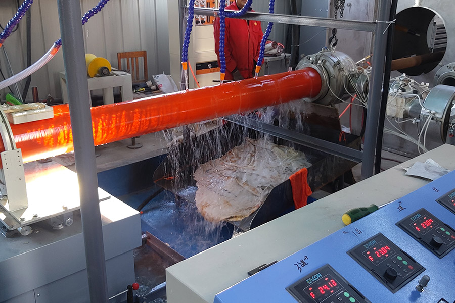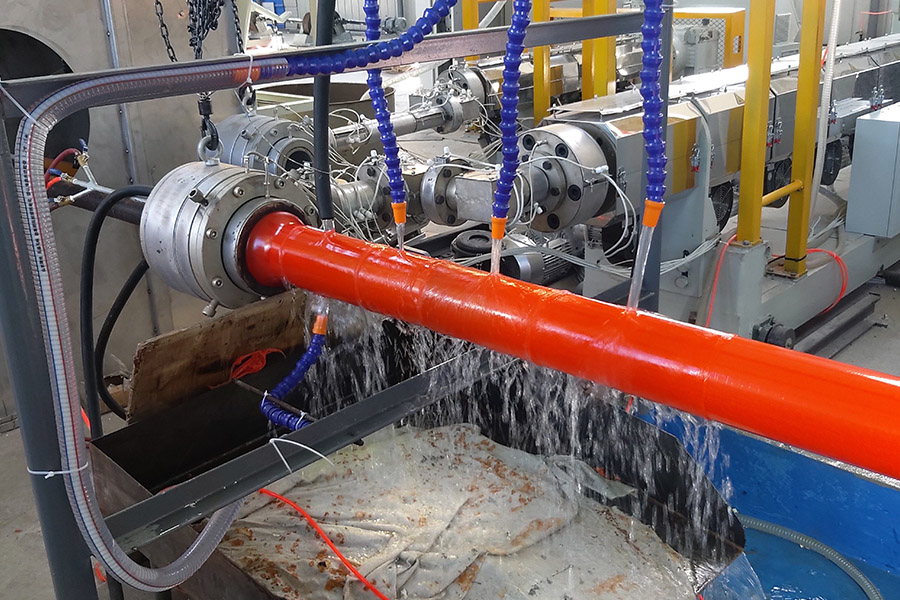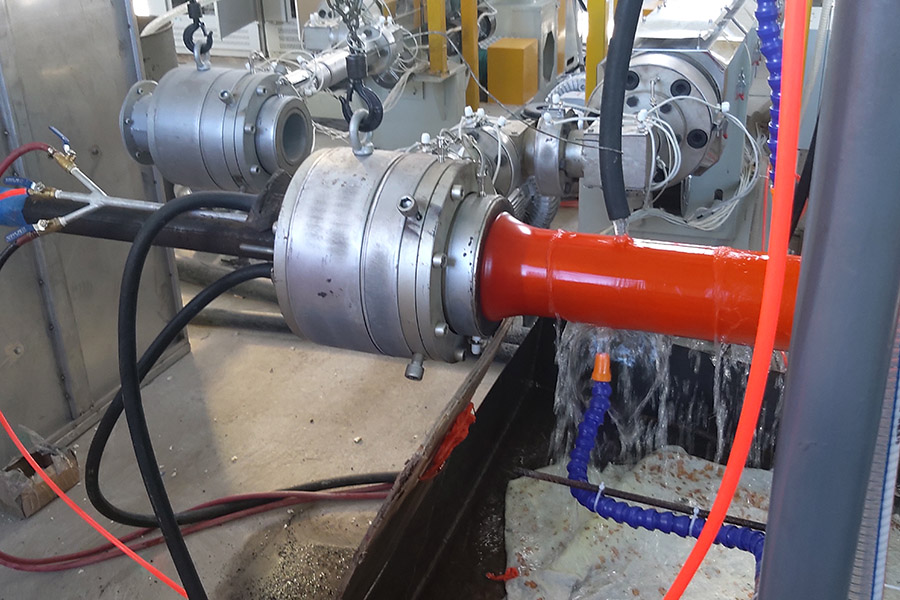 Трансмиссионная линия легко проталкивает стальную трубу в экструзионную головку и форму для нанесения покрытия.