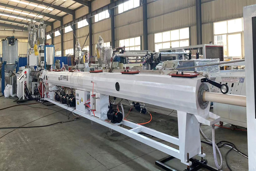 Выходящая из головки пресс-формы высокотемпературная трубная заготовка калибруется и охлаждается.